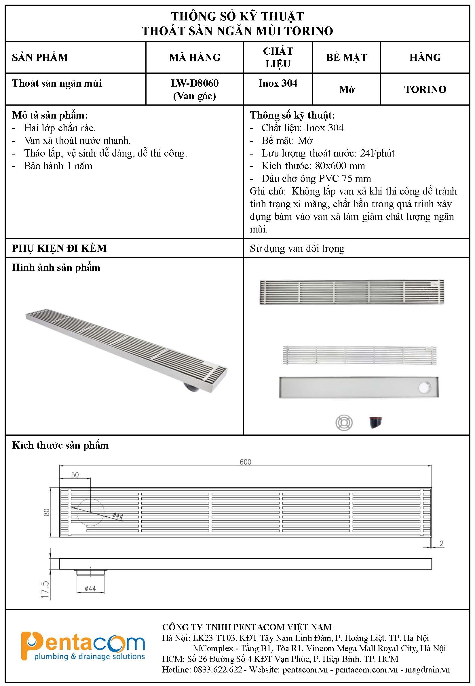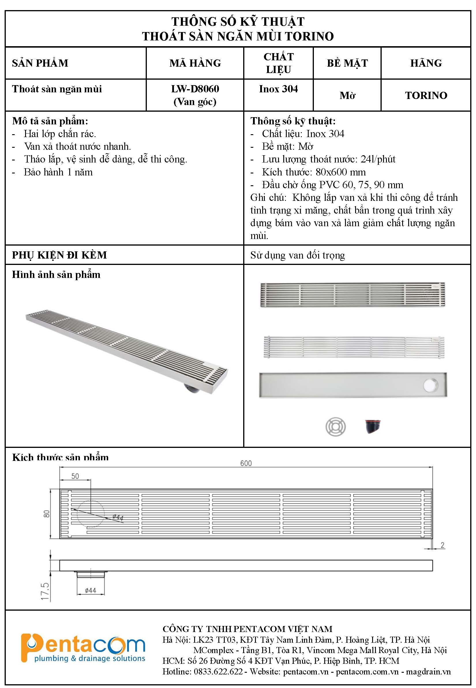 Thoát sàn máng dài LW-D8060 TORINO van góc